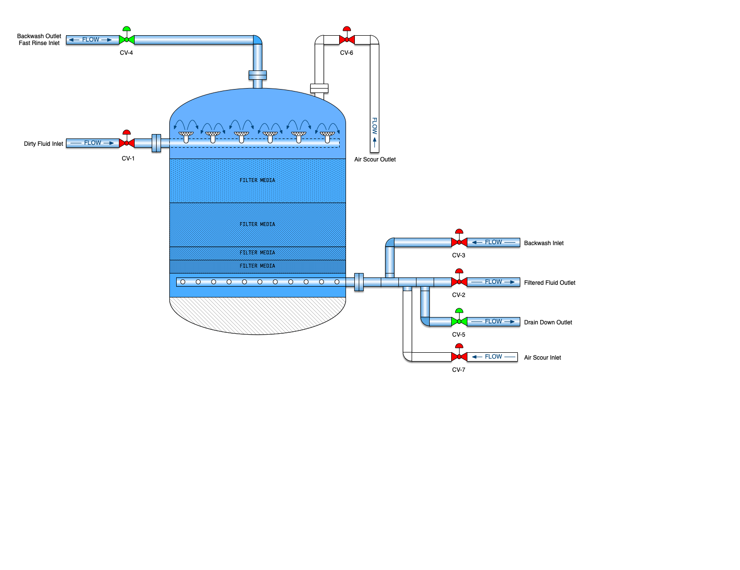 Downflow filters are just as their name implies. Water enters the filter at the top of the filter and flows down through the media and out the bottom. These are advantageous since they can operate at a higher flow rate. Up flow style filters are much better for handling very dirty water but the flow rates are lower.